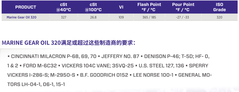 概 述:Marine Gear Oil 320 是一种固有的可生物降解,无灰、无锌、环保的高性能齿轮油。它使用基础油混合紫皇冠专有的 Synerlec 添加剂技术,获得比竞争油的性能优势。这种独特的合成添加剂技术已被证明使轴承和设备更平稳、更凉爽、更安静、更长时间、更高效。它符合美国鱼类和野生动物部以及 EPA 对海洋生物的毒性测试要求。本油品是一种出色的高性能齿轮油,用于恶劣环境,如海上平台和其他海洋相关服务。本油品寿命长,油膜强度高,可大大提高了设备可靠性。本油品在高腐蚀性环境中也能提供出色的保护。适 用:用于恶劣环境且需要环境保护的场合,如海上平台和其他海洋相关服务。性 能:高油膜强度:采用 Synerlec 添加剂技术,具有高强度油膜。更长的油寿命:具有出色的氧化稳定性,保持设备清洁。出色的防腐保护:在金属表面形成离子键,在设备运行或停机时都能提供润滑和防腐保护,在启动时提供即时润滑,防止磨损。提高系统性能:能在更低温度下提供平稳、一致的润滑保护。快速从水分离:具有快速、完全水分离能力,很容易从储油罐底部排干,保持油品干燥。合成清洁能力:能清除设备系统的脏污并保持清洁。与密封件兼容:具有出色的密封兼容性。